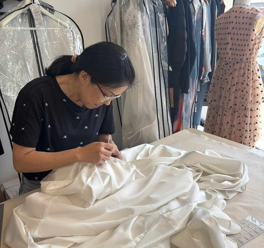 We work on all types of wedding dresses, from modern minimalist gowns to intricate lace and beaded designs. We’re experienced in working with a wide range of fabrics, silhouettes, and construction styles.